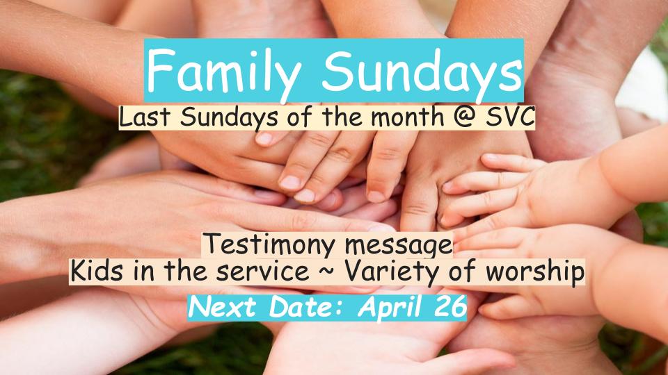 - 4th or 5th Sundays are Family Sundays where all ages participate in the main auditorium for the whole service.